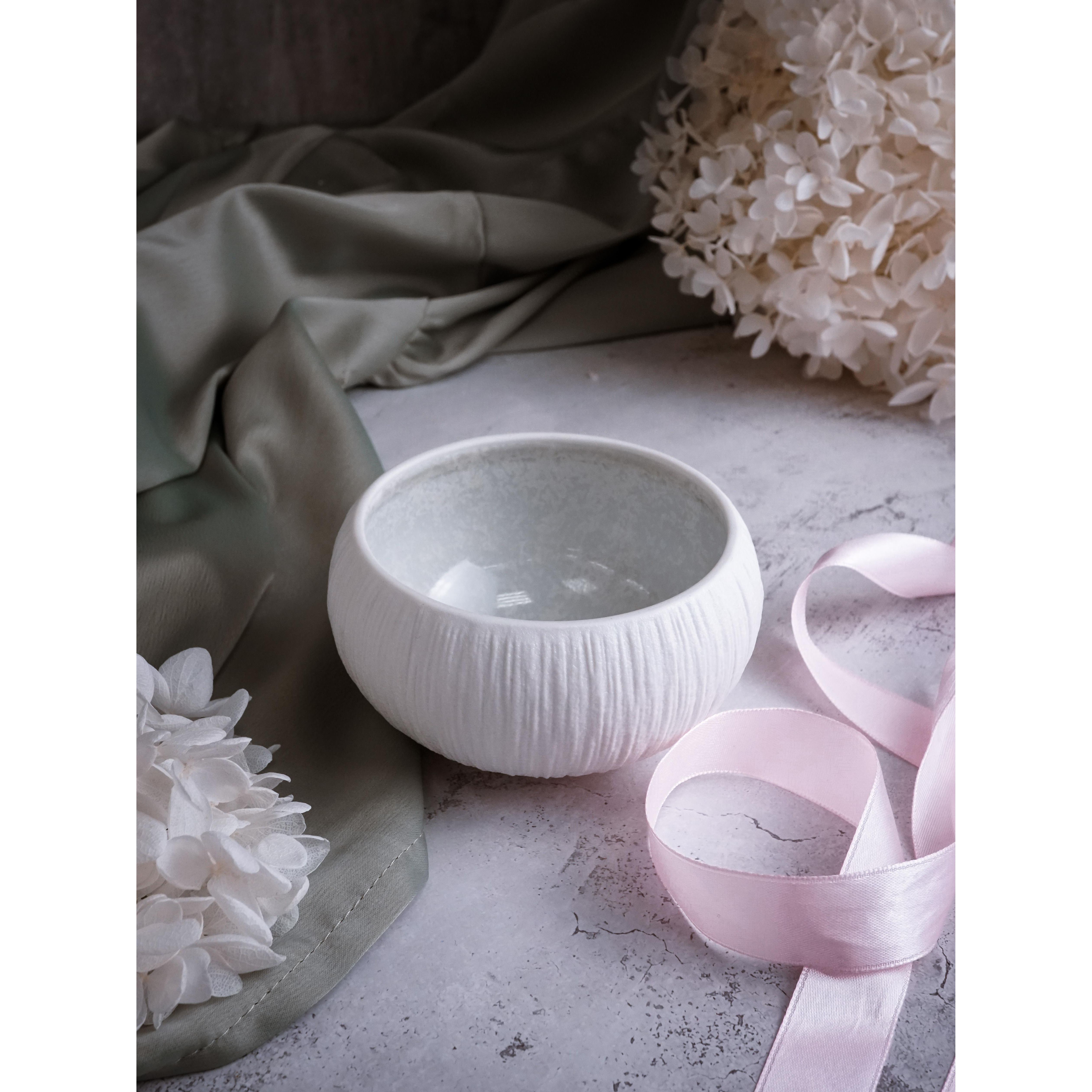 Особого восхищения заслуживает изящная фактурная отделка, украшающая внешние стенки рамекина: рельефные линии, спадающие мягкими волнами, создают удивительную аналогию с лёгкой балетной пачкой, словно застывшей в изящном пируэте, что отсылает к великому искусству танца и наполняет этот предмет особой динамикой и воздушностью.