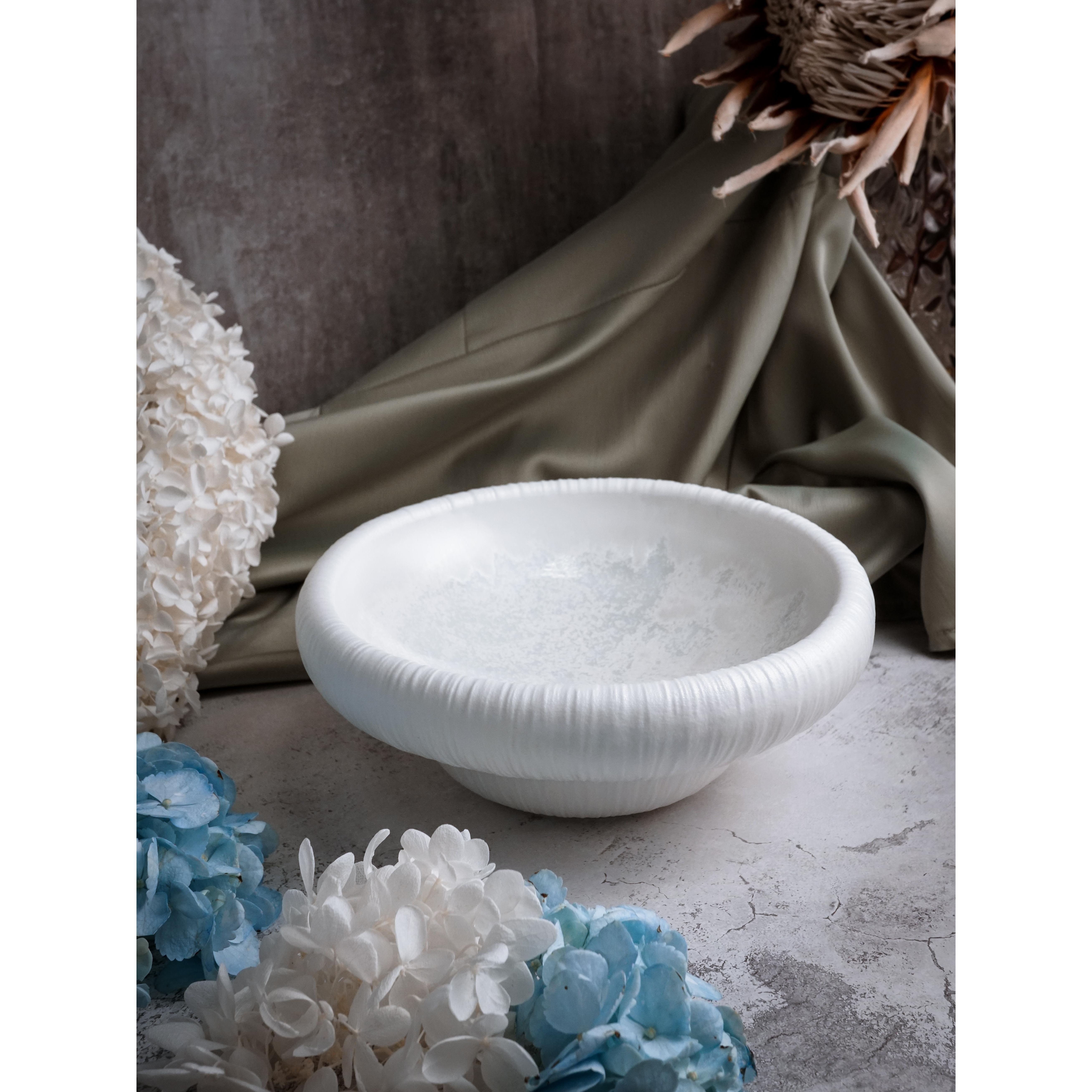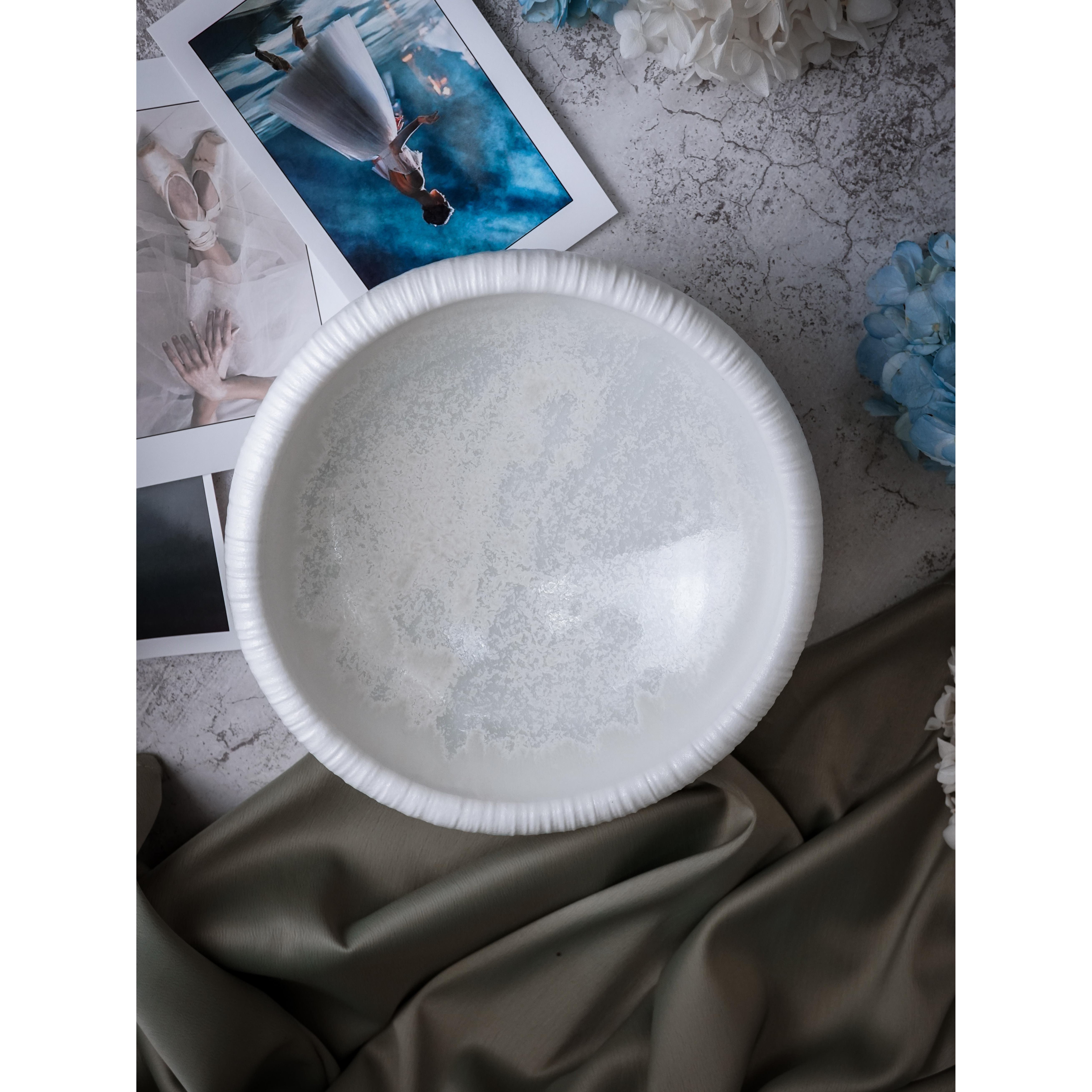 Особого восхищения заслуживает изящная фактурная отделка, украшающая внешние стенки салатника: рельефные линии, спадающие мягкими волнами, создают удивительную аналогию с лёгкой балетной пачкой, словно застывшей в изящном пируэте, что отсылает к великому искусству танца и наполняет этот предмет особой динамикой и воздушностью.