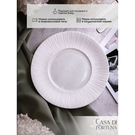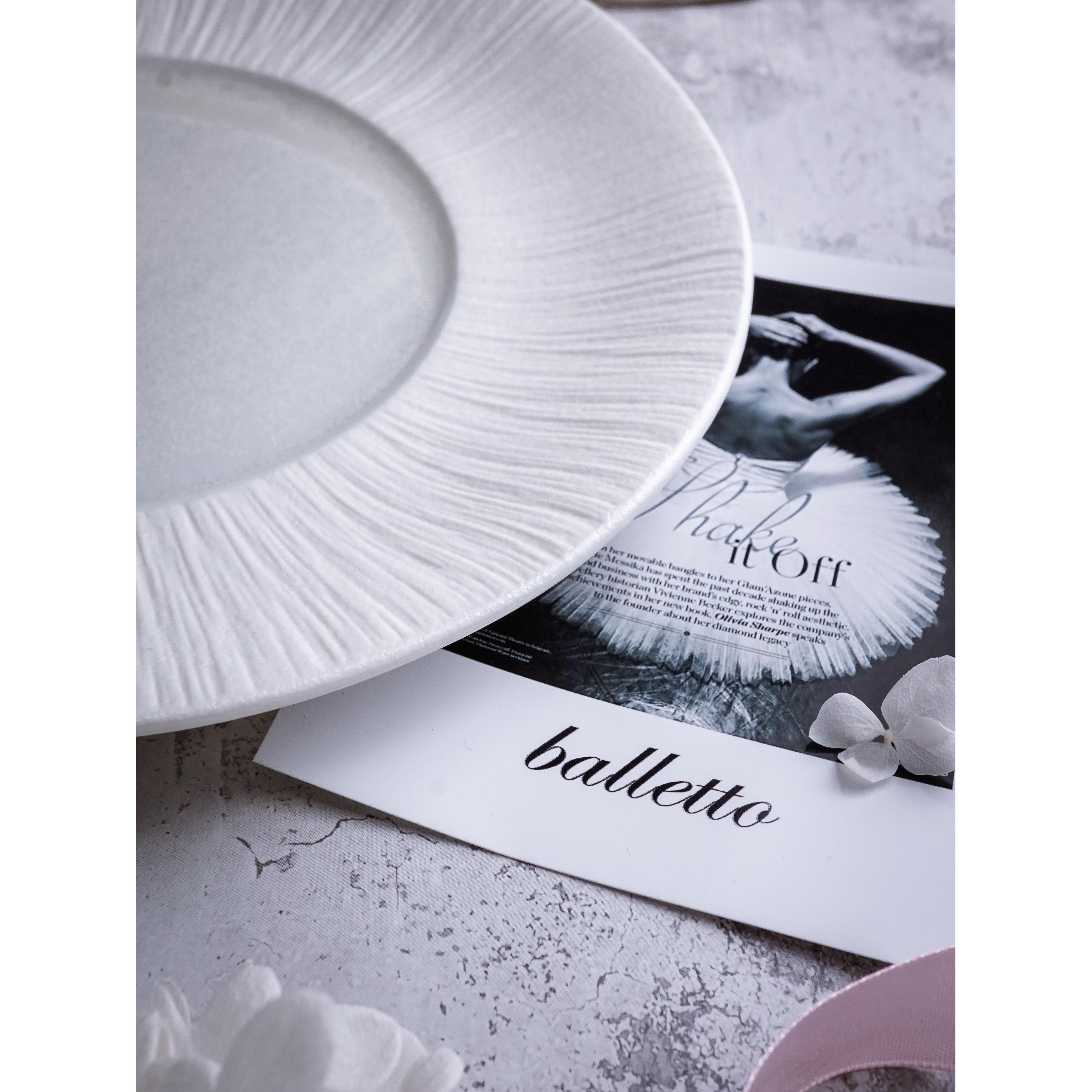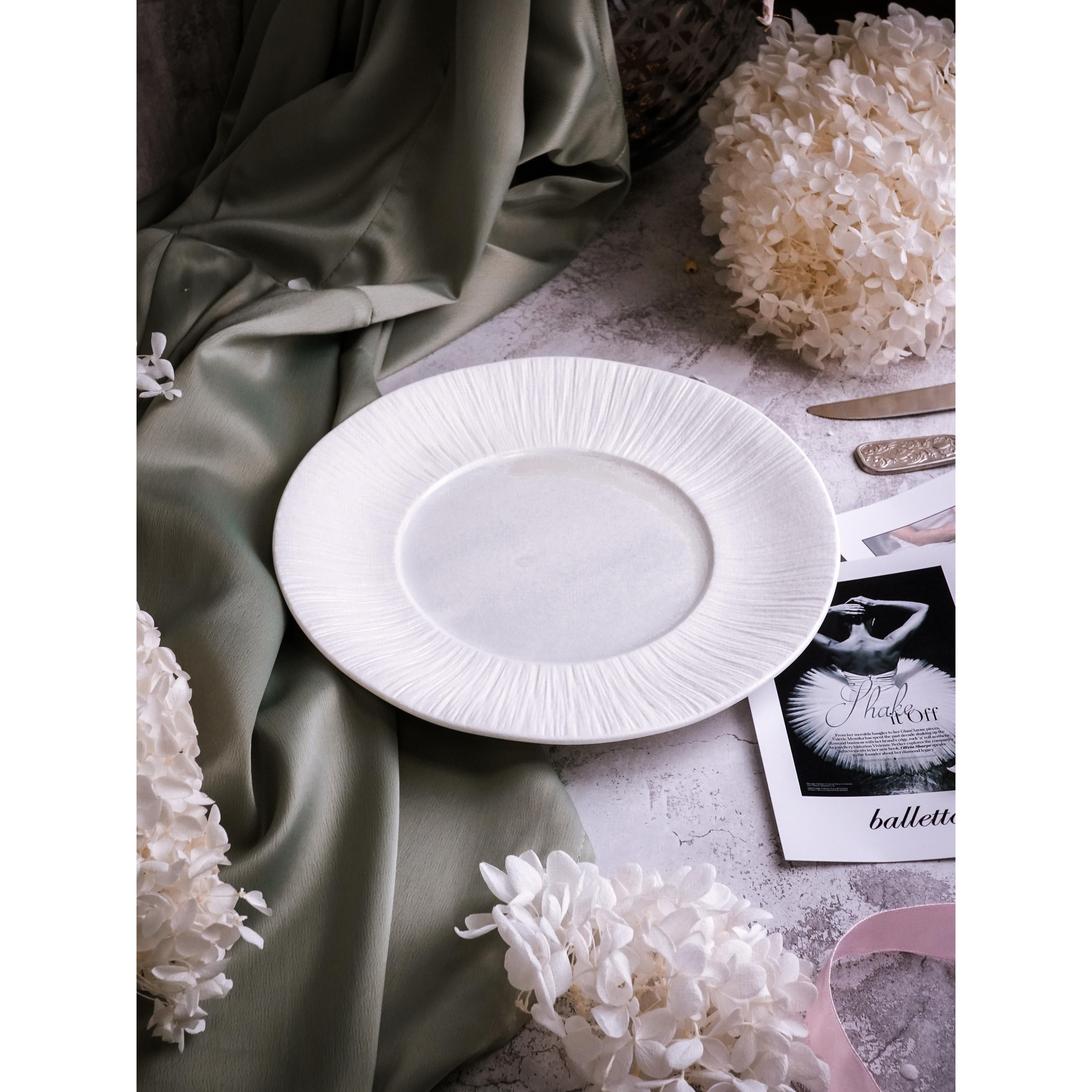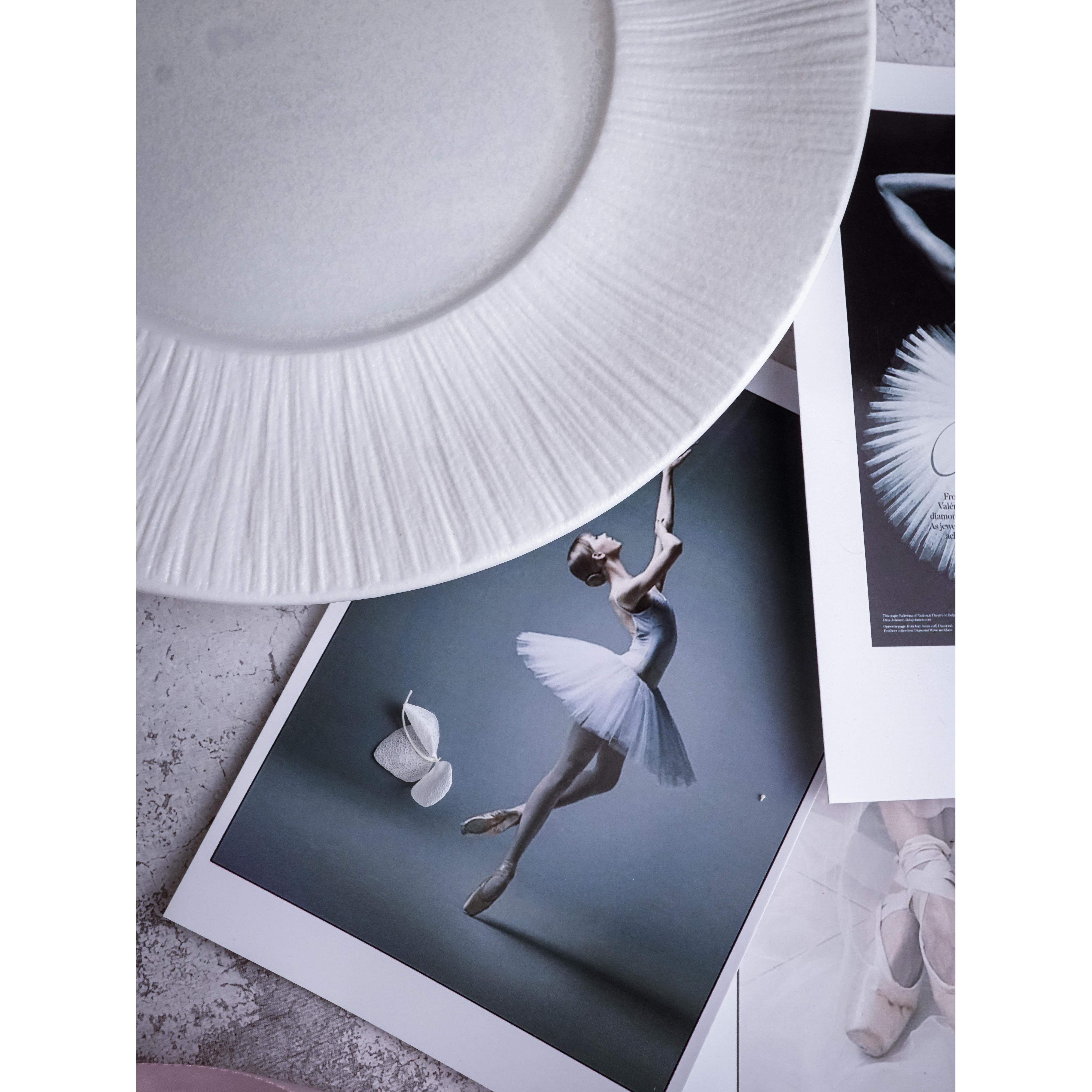 Особого восхищения заслуживает изящная фактурная отделка, украшающая край тарелки: рельефные линии, спадающие мягкими волнами, создают удивительную аналогию с лёгкой балетной пачкой, словно застывшей в изящном пируэте, что отсылает к великому искусству танца и наполняет этот предмет особой динамикой и воздушностью, делая даже самую простую сервировку выразительной и запоминающейся.