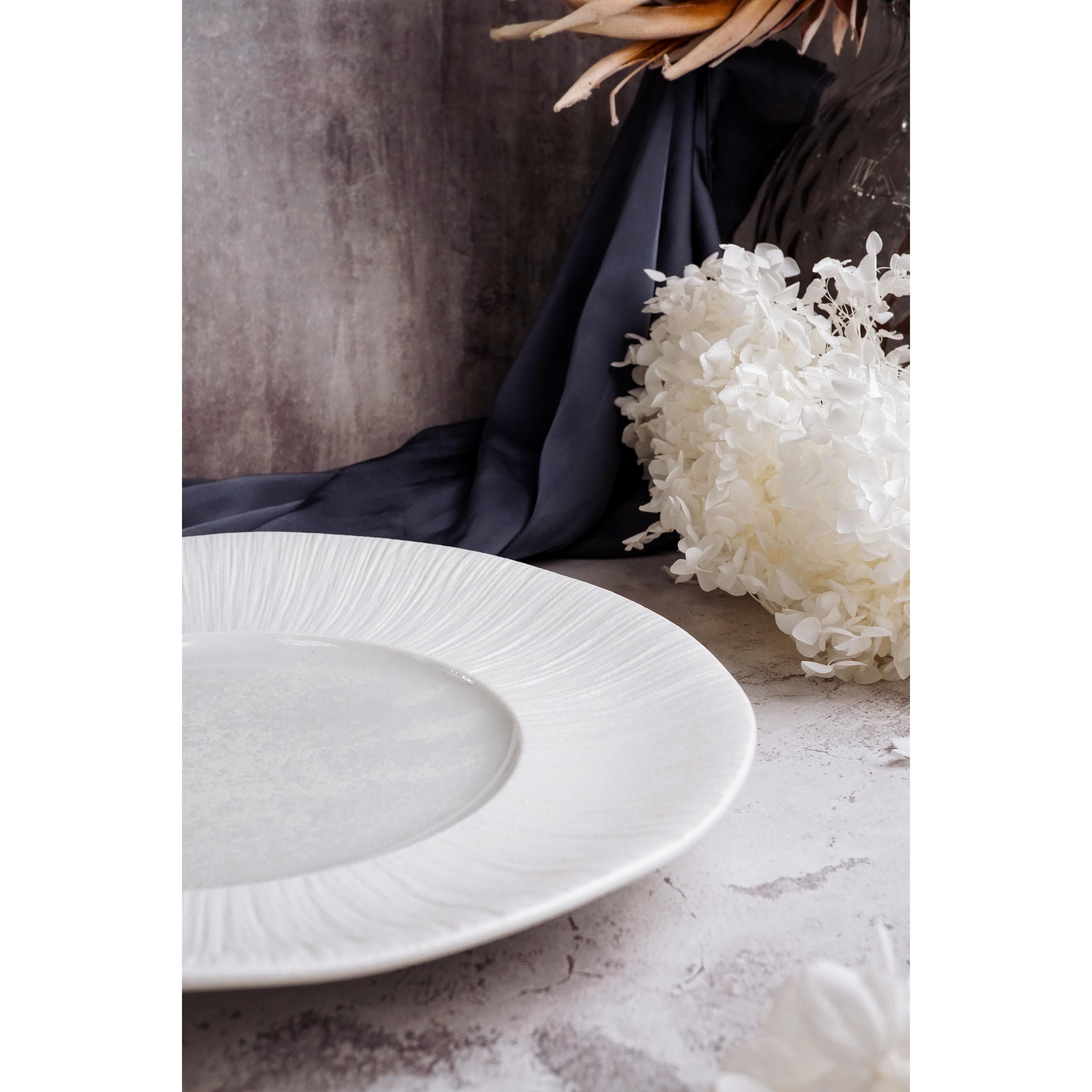 Особого восхищения заслуживает изящная фактурная отделка, украшающая край тарелки: рельефные линии, спадающие мягкими волнами, создают удивительную аналогию с лёгкой балетной пачкой, словно застывшей в изящном пируэте, что отсылает к великому искусству танца и наполняет этот предмет особой динамикой и воздушностью, превращая простую сервировку в настоящее действо.