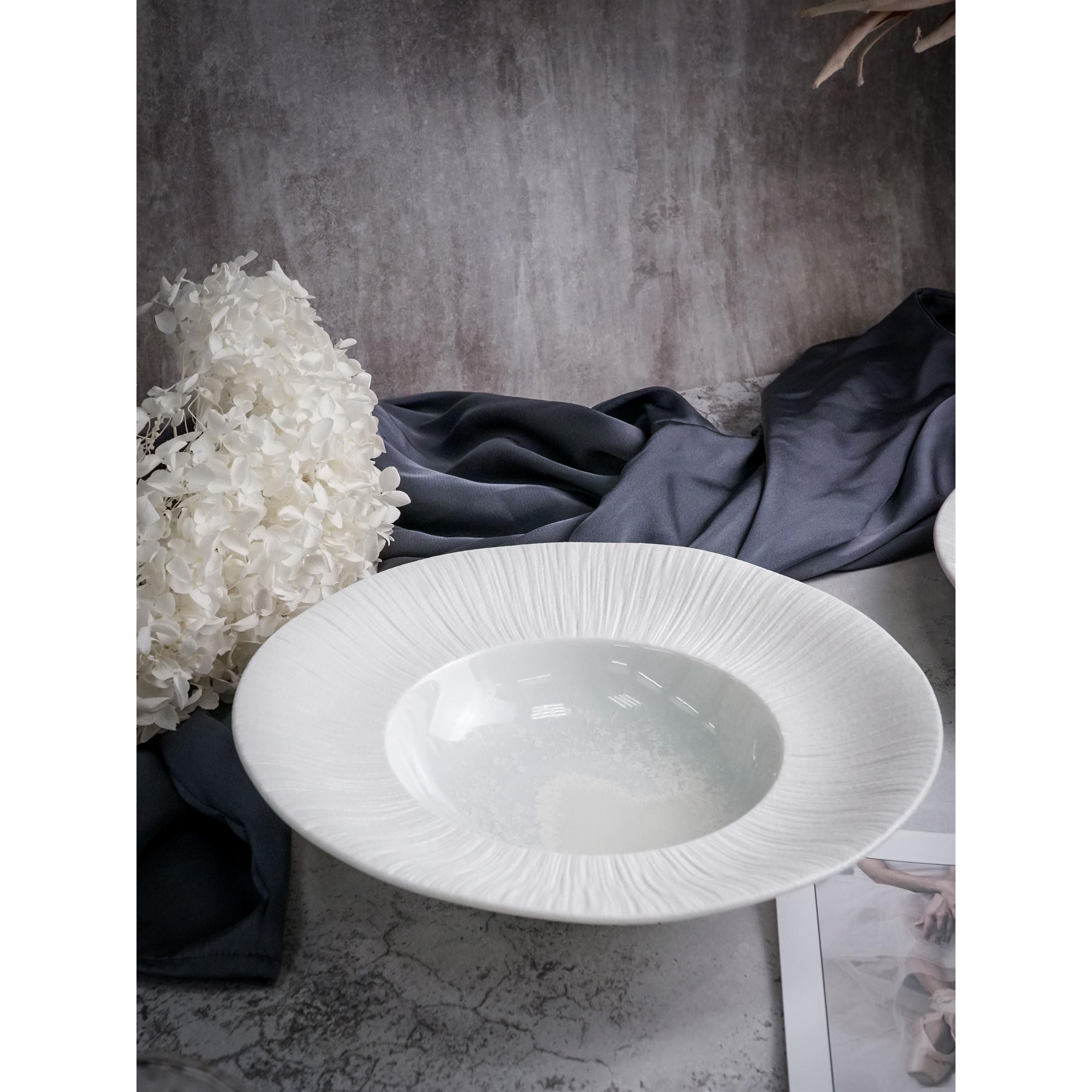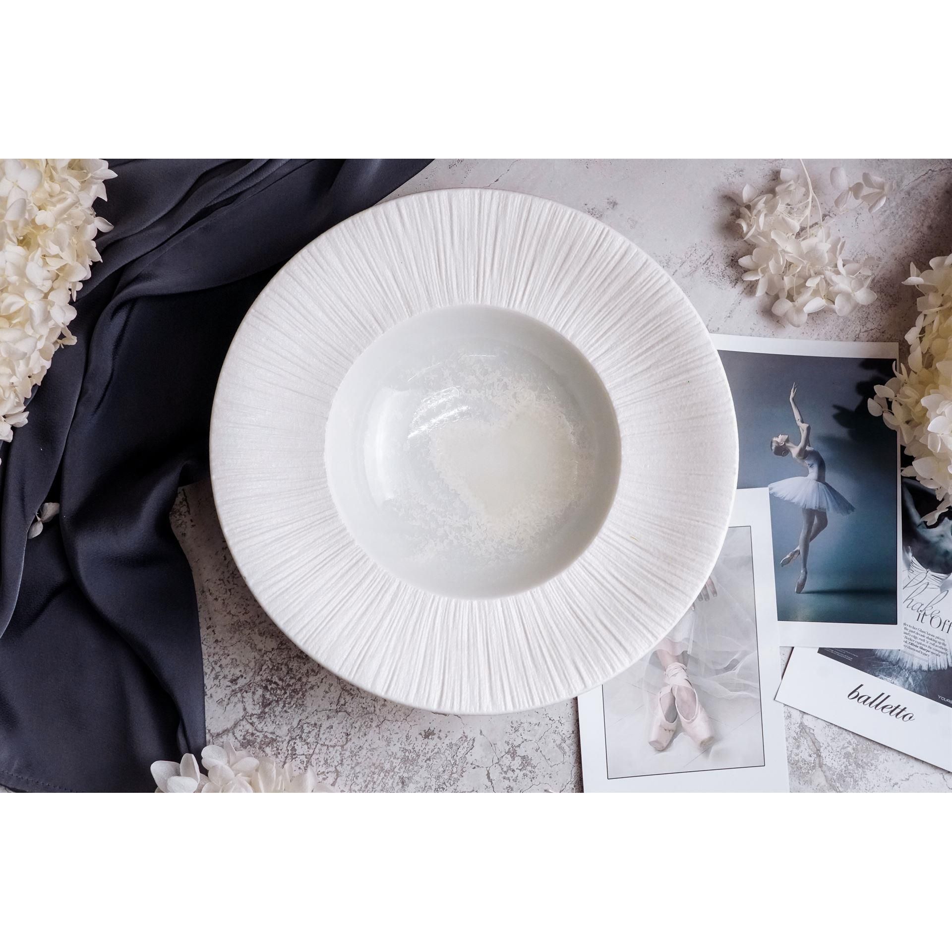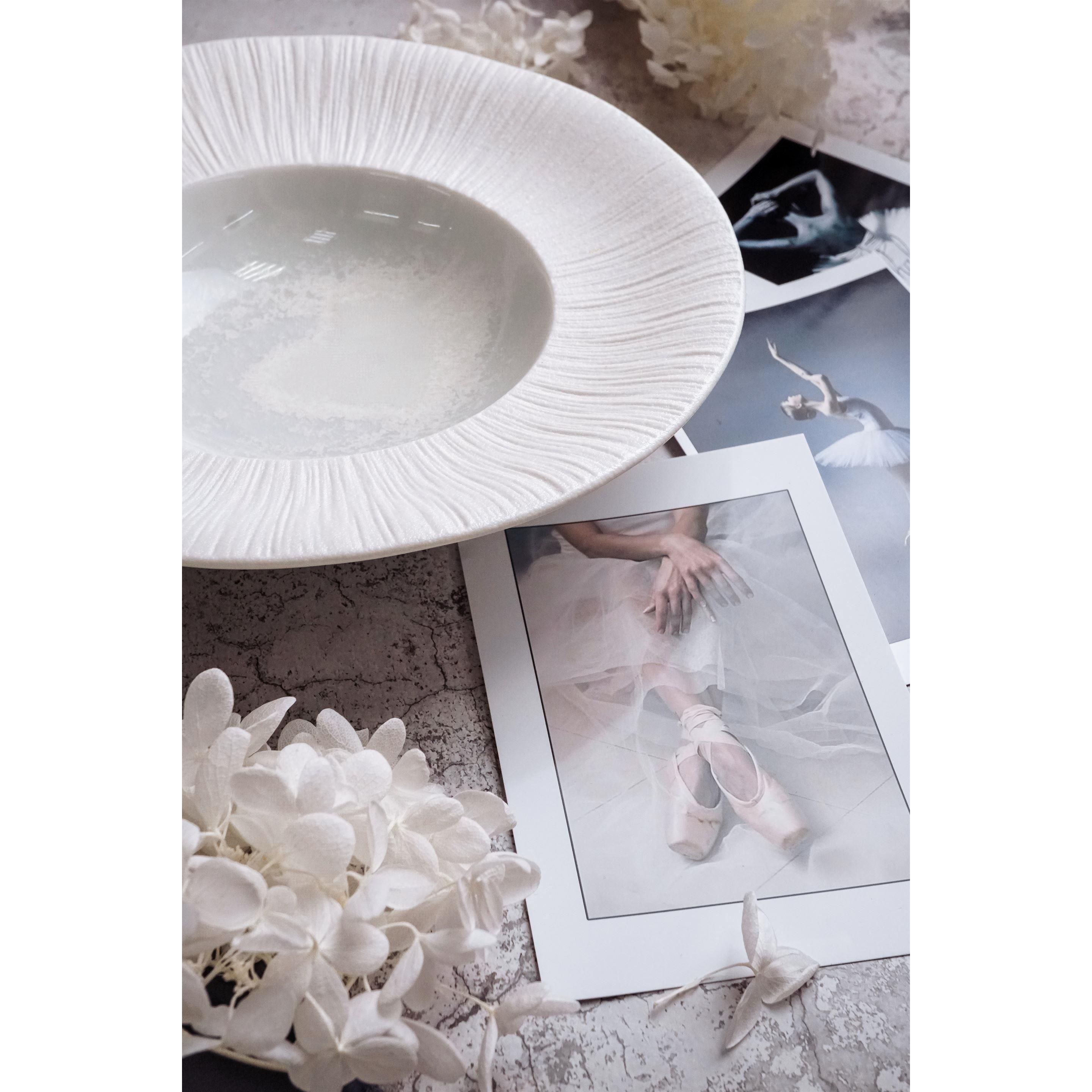 Особого восхищения заслуживает изящная фактурная отделка, украшающая край тарелки: рельефные линии, спадающие мягкими волнами, создают удивительную аналогию с лёгкой балетной пачкой, словно застывшей в изящном пируэте, что отсылает к великому искусству танца и наполняет этот предмет особой динамикой и воздушностью, превращая каждую подачу в маленькое гастрономическое представление.