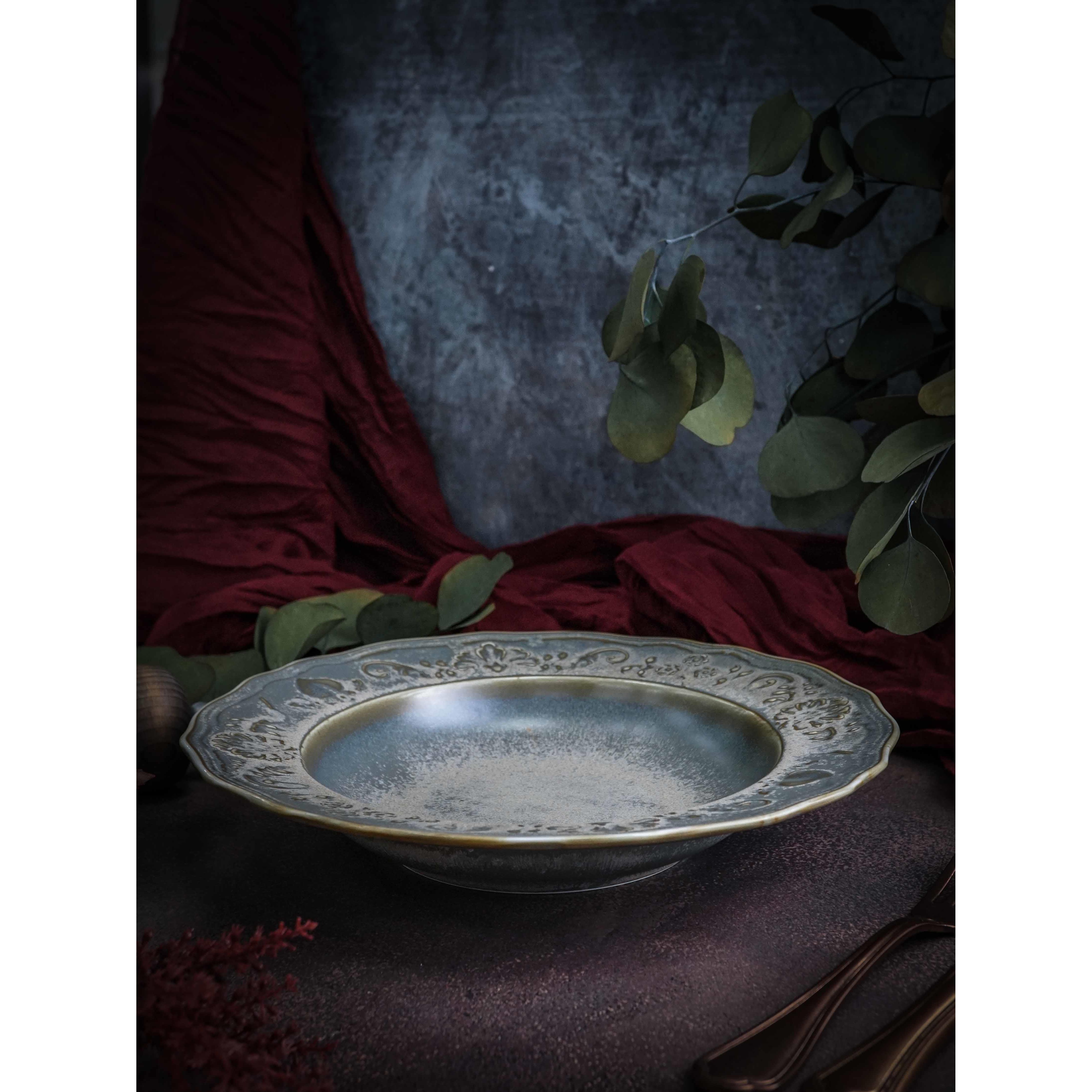 Глубокая тарелка, которая с равным успехом может служить и изящной тарелкой для пасты, объемом 470 миллилитров из коллекции Vintage от Casa di Fortuna — воплощение аутентичного стиля, где щедрый формат и универсальная глубина создают идеальное пространство для подачи самых разнообразных блюд — от ароматных супов и рагу до изысканных паст с соусом, требующих особого обрамления.